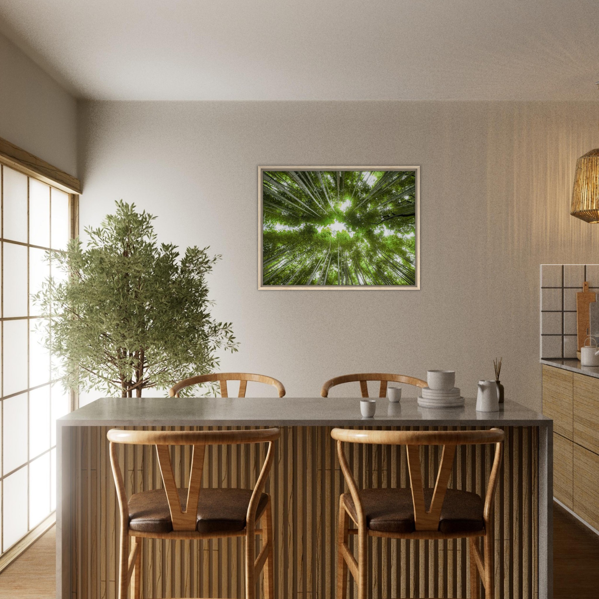 As wall art, Forest Canopy brings a sense of calm, openness, and natural energy into a room. The lush green tones pair beautifully with neutral interiors, natural materials, and modern design spaces. Whether displayed in a living room, office, or bedroom, the upward perspective introduces a feeling of space and tranquility to the wall.