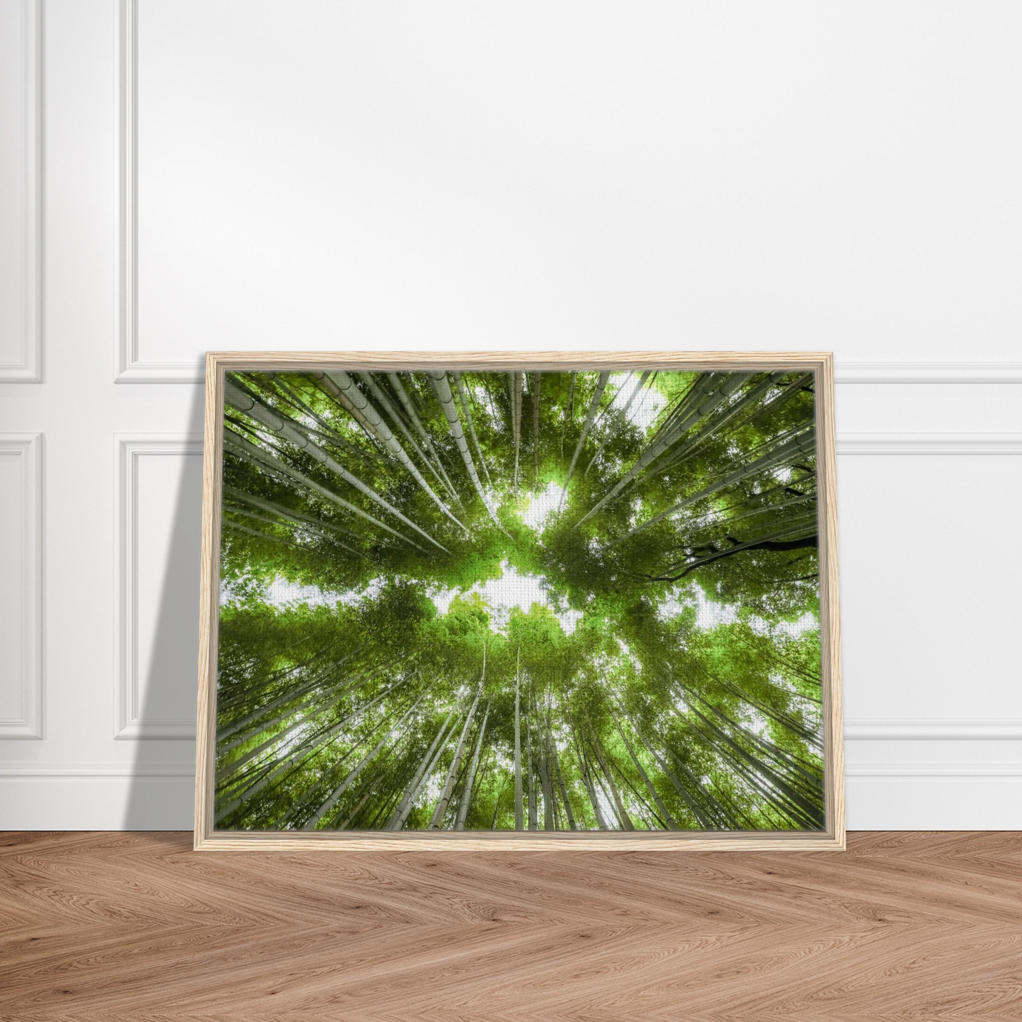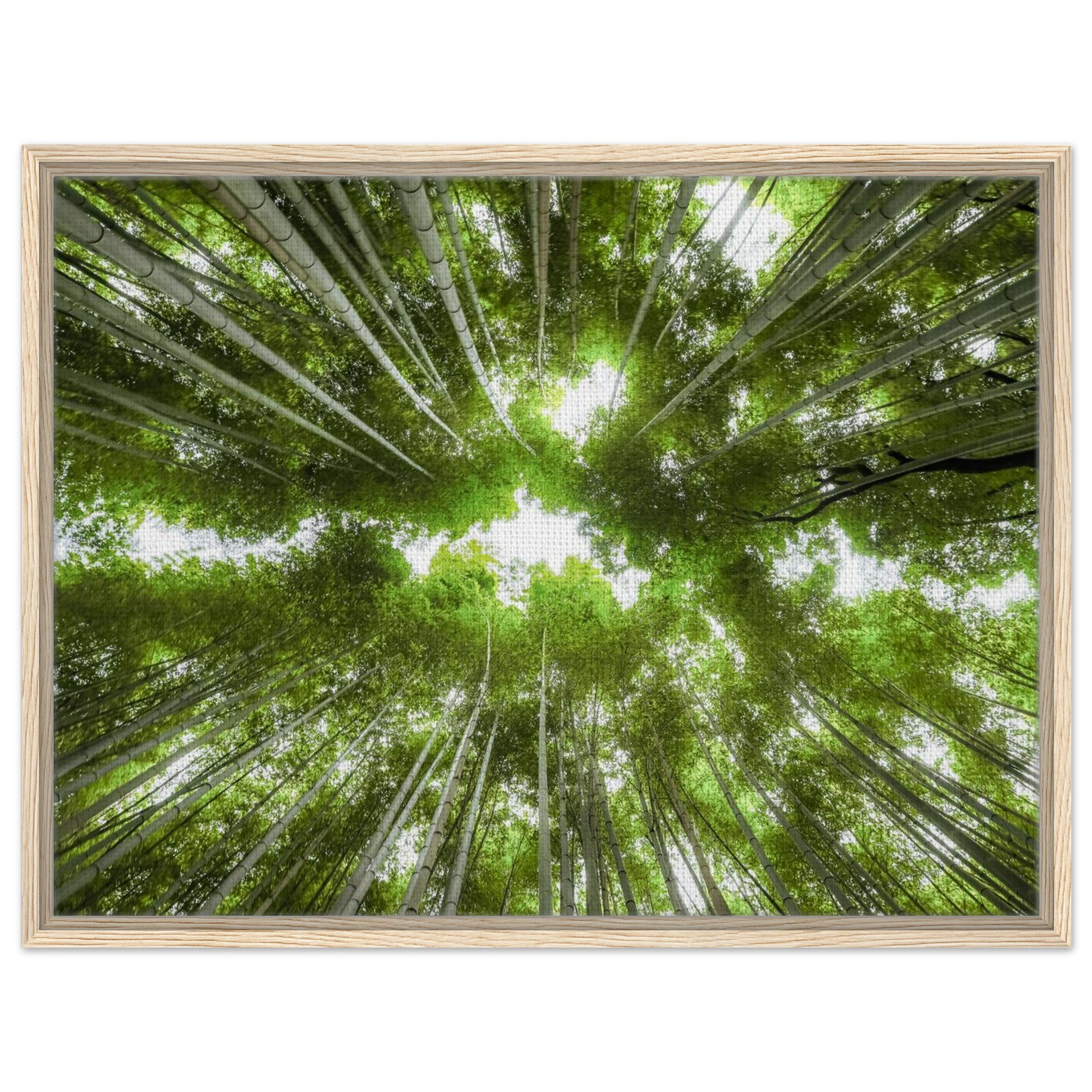 The composition transforms the forest into a dynamic pattern of structure and light. Bamboo trunks converge toward the center of the frame while a luminous canopy of leaves filters sunlight above. The result is a sense of depth and movement that invites the viewer to pause and look upward into the living architecture of the forest.