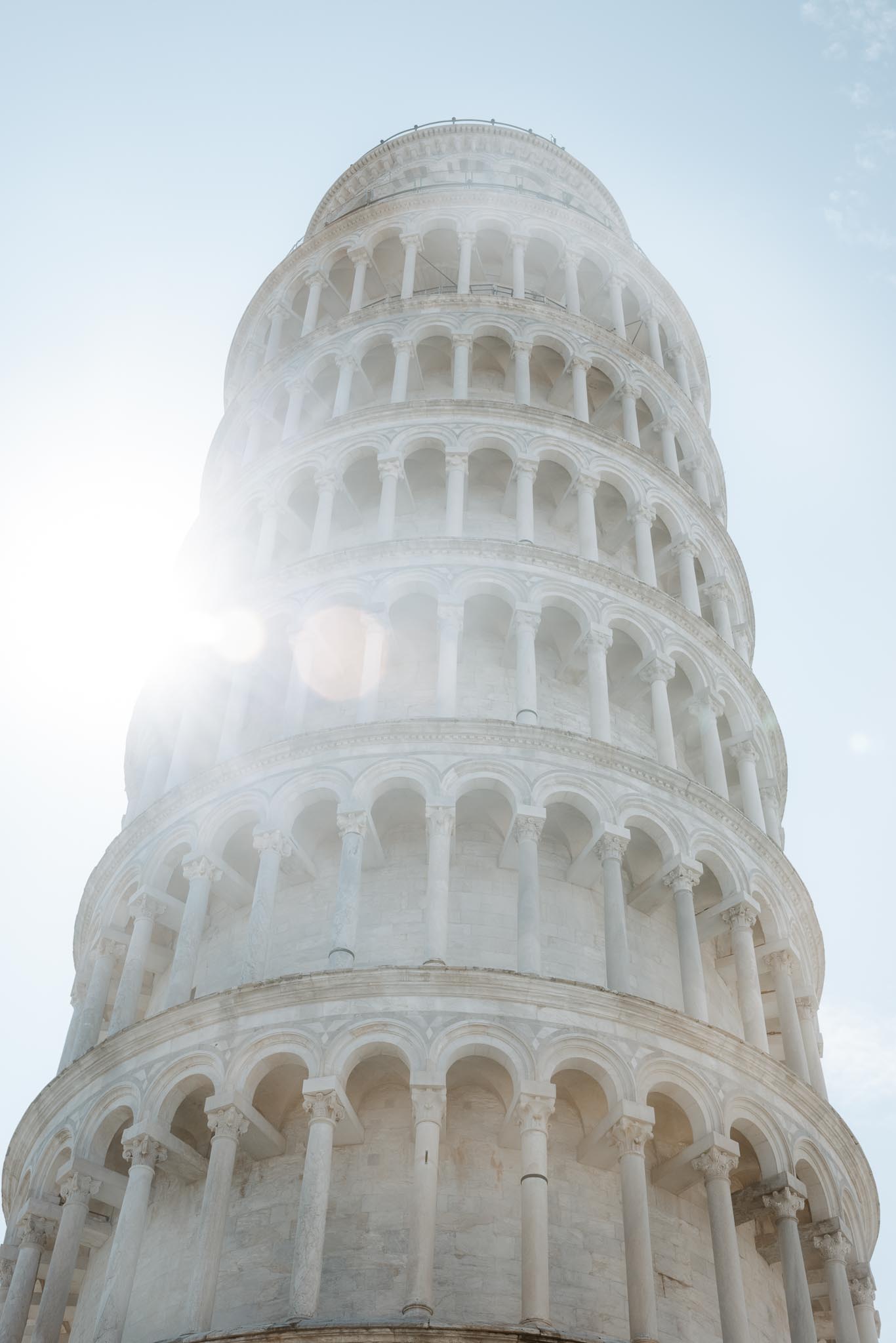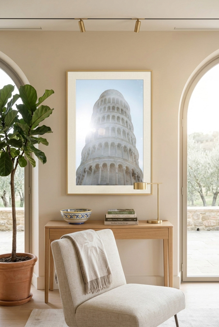 This Leaning Tower of Pisa fine art print captures the iconic Italian landmark rising into soft morning light. The upward perspective emphasizes the tower’s repeating arches and elegant marble columns, allowing the historic architecture to unfold layer by layer as it climbs toward the sky.