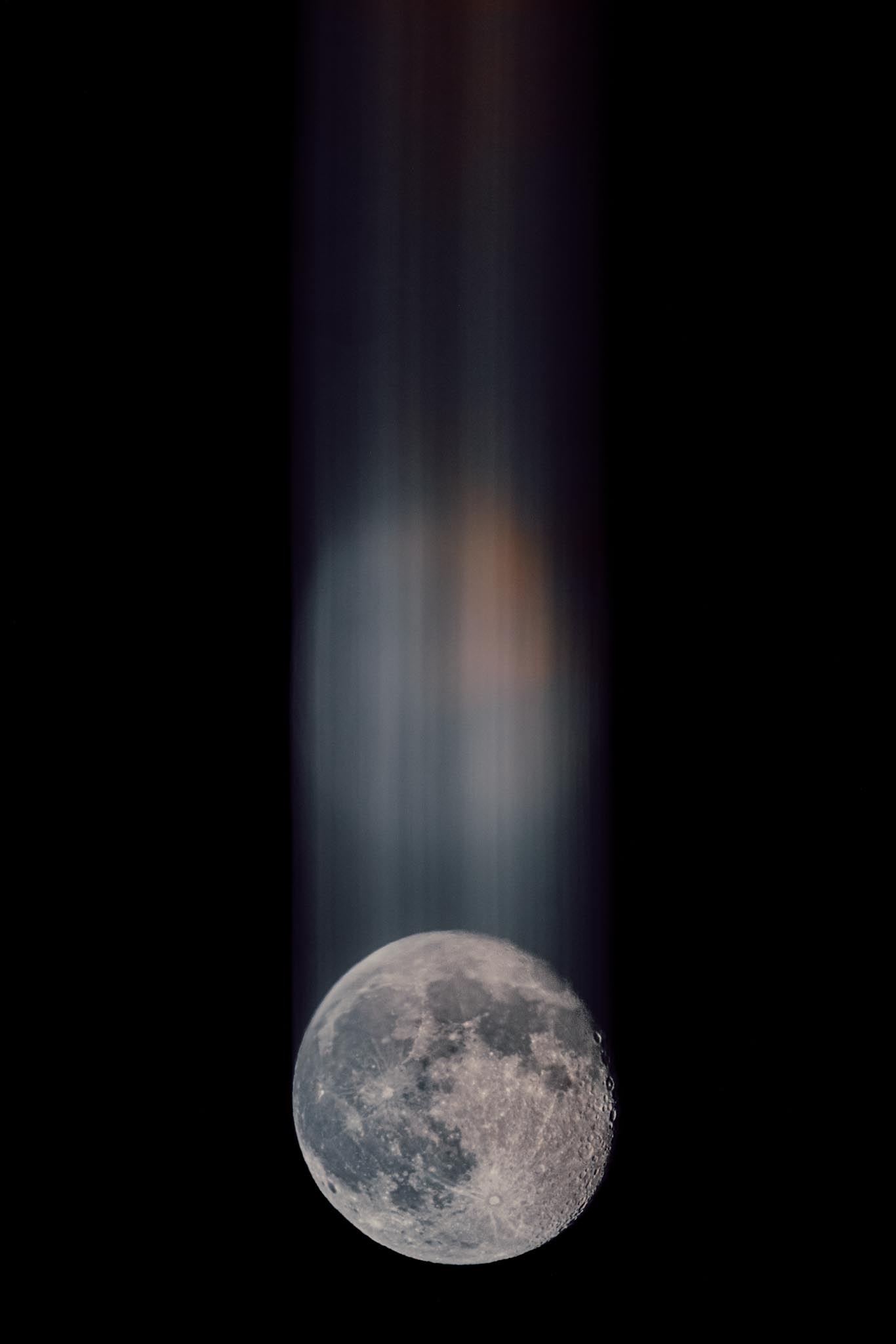 In this photograph, the familiar shape of the moon becomes something more symbolic—a point of origin from which light appears to rise. The minimal composition allows the viewer to focus on the relationship between the moon and the vertical streaks of color, transforming a simple celestial subject into a contemplative visual study of light and space.