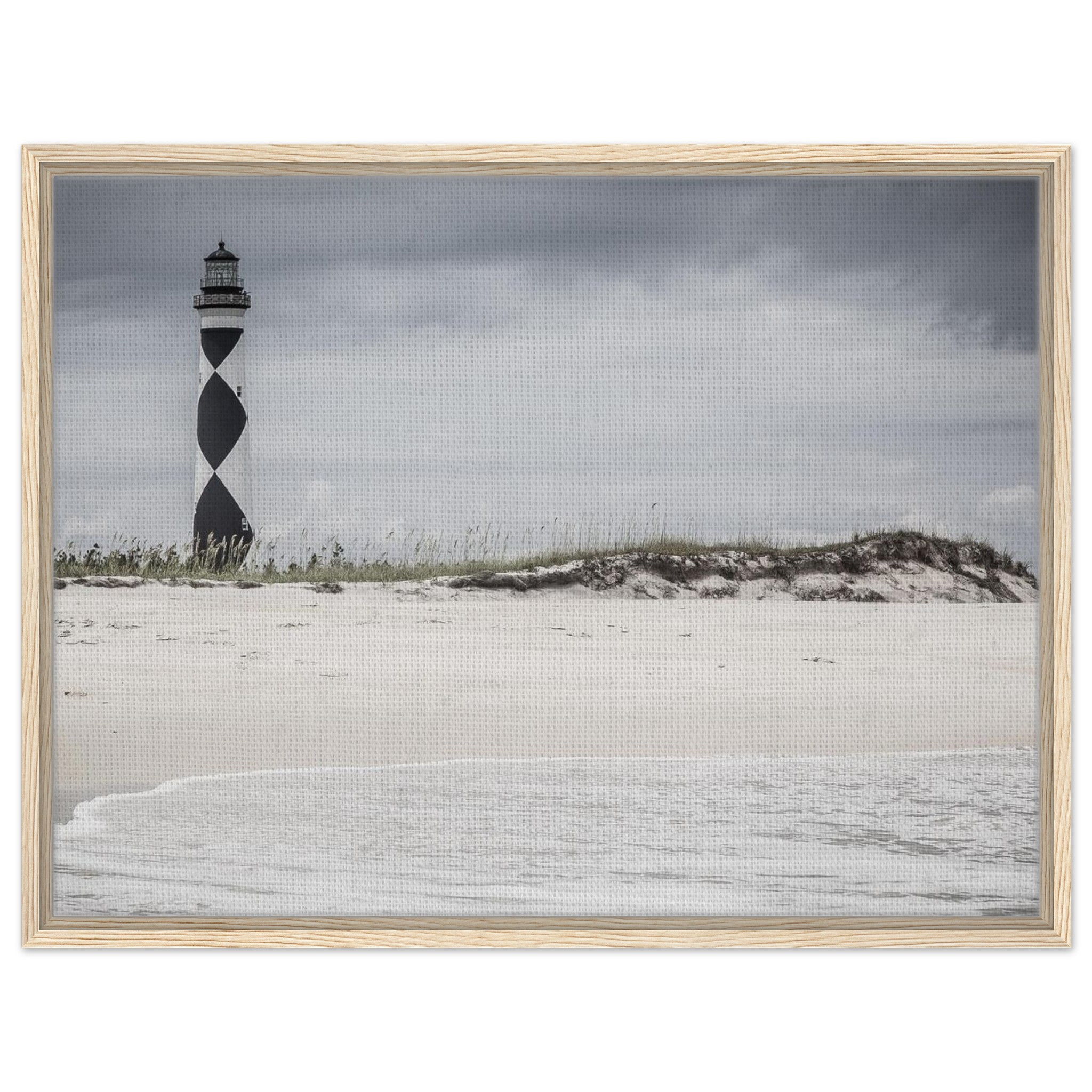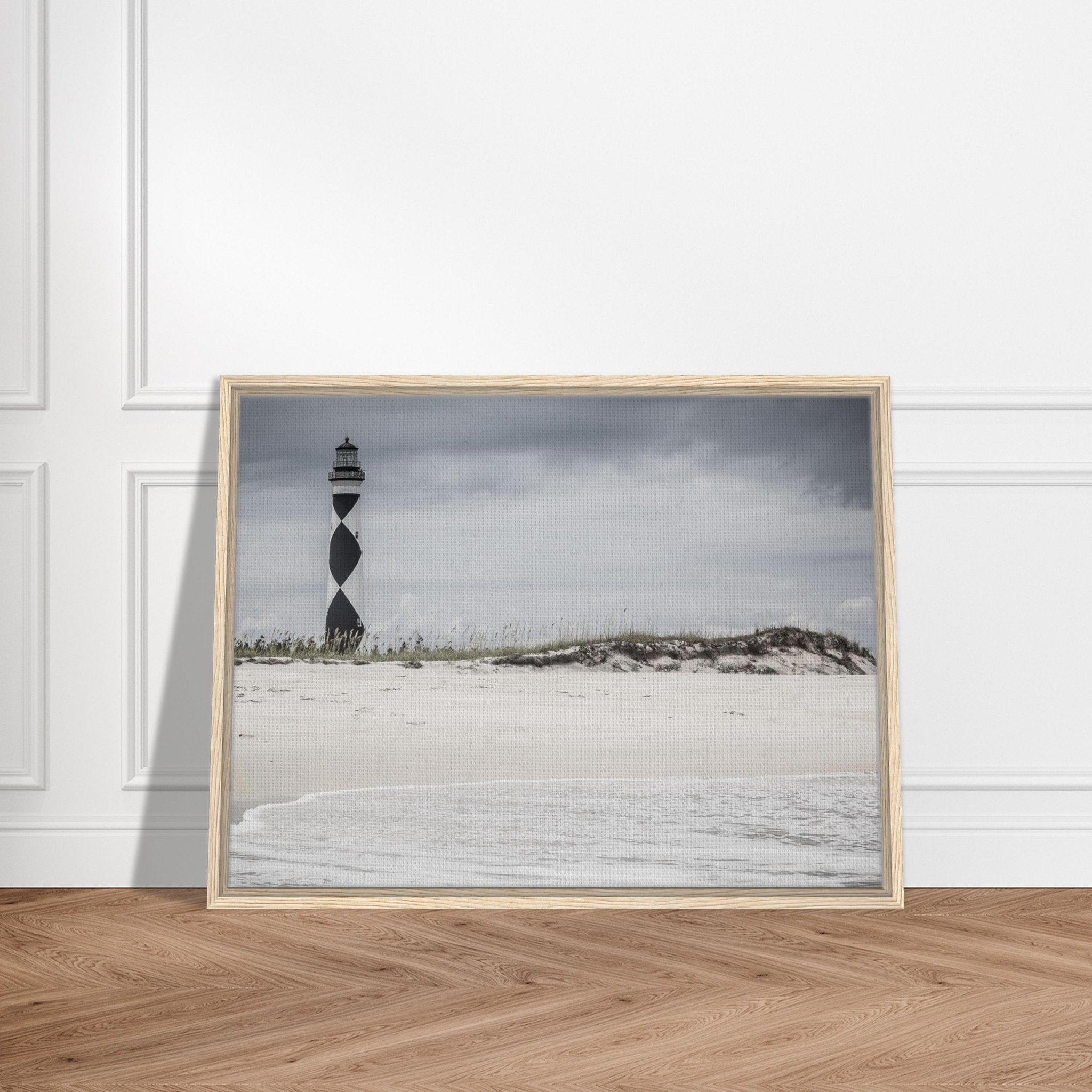 Standing quietly above windswept dunes, the lighthouse in Sentinel of the Shore rises against a brooding coastal sky along the shoreline of the Carolinas. The iconic black-and-white diamond pattern of the tower contrasts beautifully with the soft tones of sand, sea grass, and rolling surf.