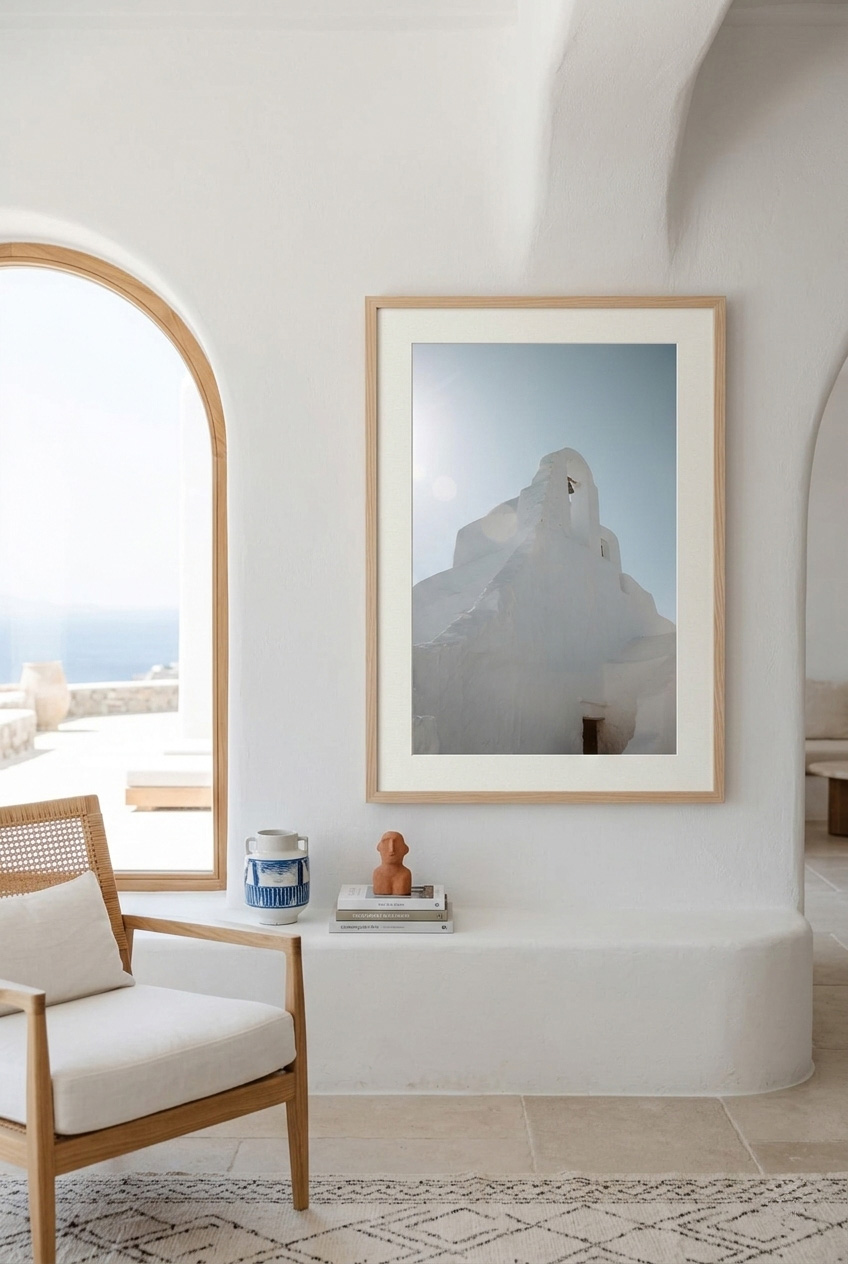 Printed as a museum-quality archival photograph, The Bell Above brings the clean lines and luminous atmosphere of Mediterranean architecture into interior spaces. Its soft palette and minimal composition make it especially well suited for modern interiors and collectors drawn to architectural photography and travel-inspired fine art.