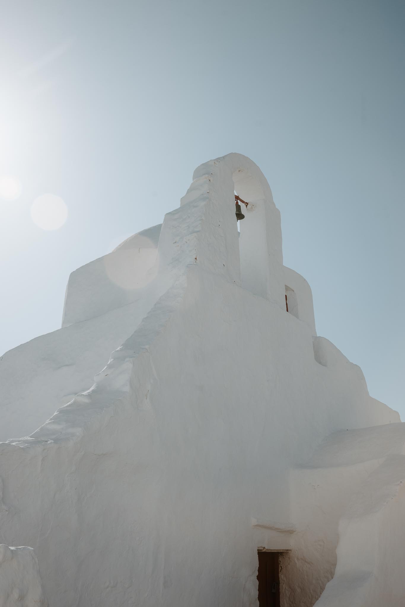 Photographed on the island of Mykonos, the scene reflects the understated beauty that defines much of the Greek islands. The bright white structure stands in quiet contrast against the pale blue sky, allowing the small bell to become a subtle focal point within the larger architectural form.
