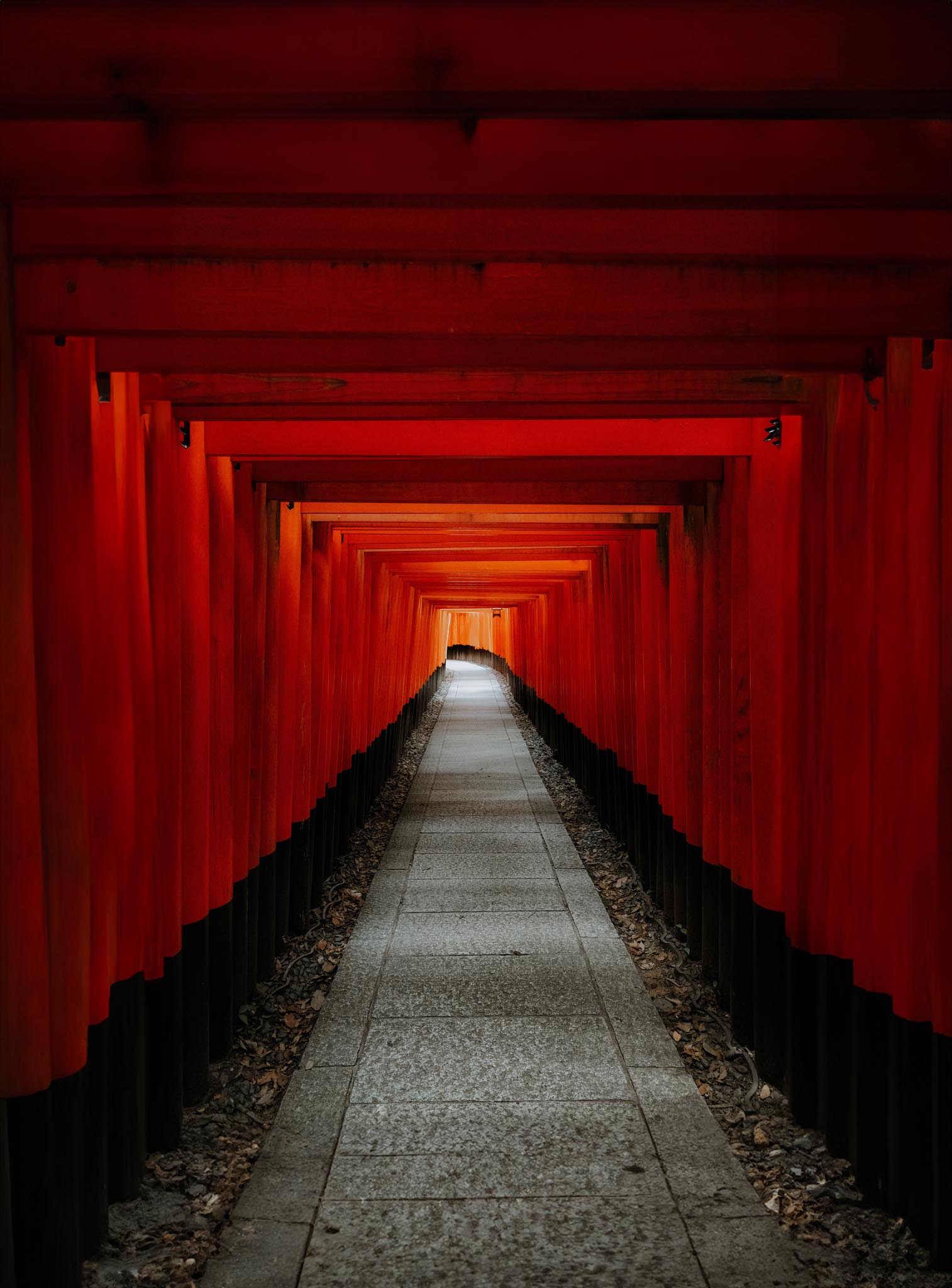 In The Quiet at Fushimi, the pathway becomes a study in repetition and depth. Each gate frames the next, drawing the viewer forward through a narrowing sequence of lines and glowing red tones. The strong geometry of the structure contrasts with the soft natural light filtering through the passageway, giving the image a calm and contemplative atmosphere.
