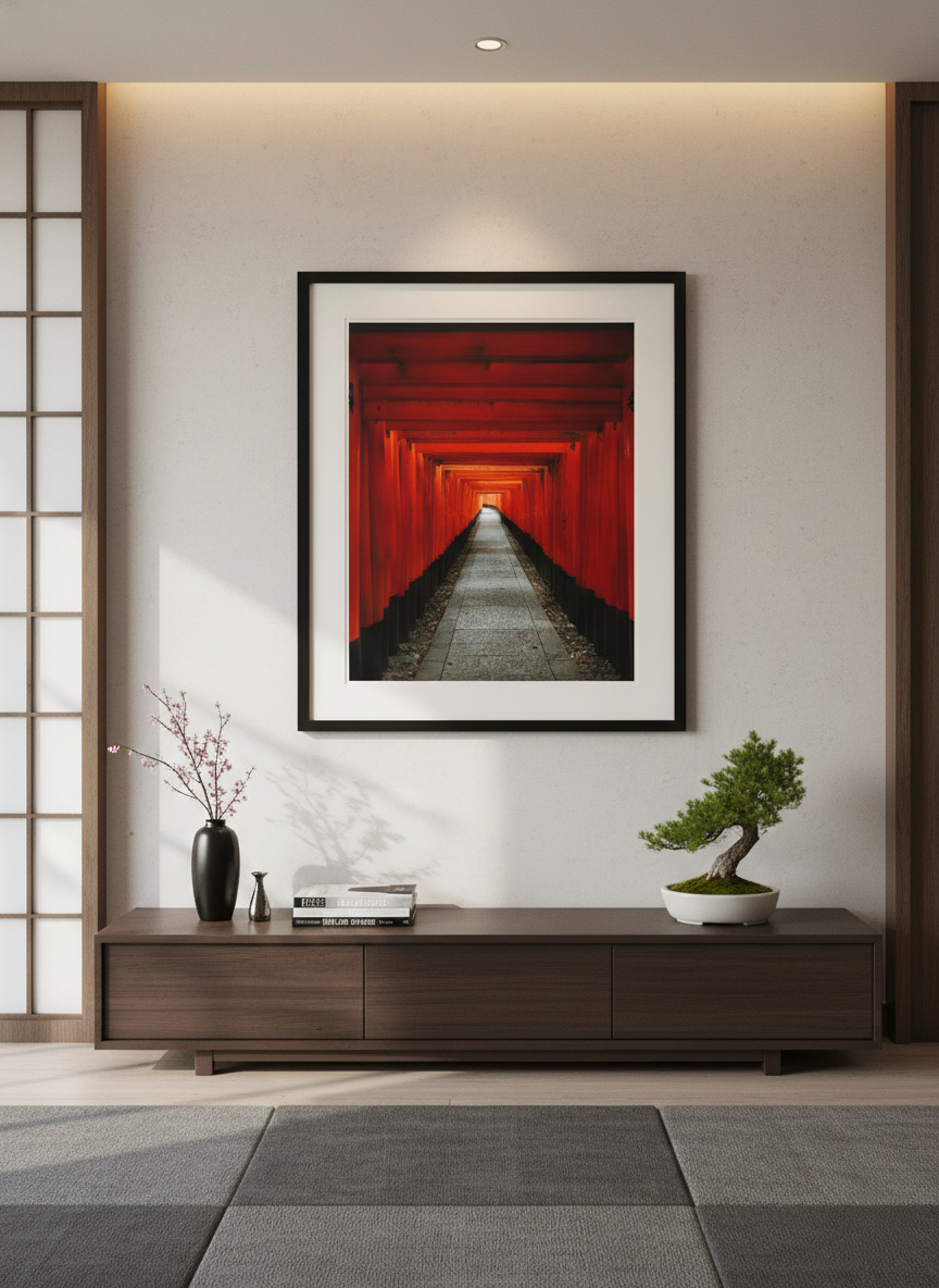 Printed as a museum-quality archival photograph, this Fushimi Inari torii gate print brings the architectural beauty and cultural symbolism of Kyoto into interior spaces. The bold color palette and precise symmetry make it a compelling piece for collectors drawn to travel photography, Japanese architecture, and minimalist compositions.